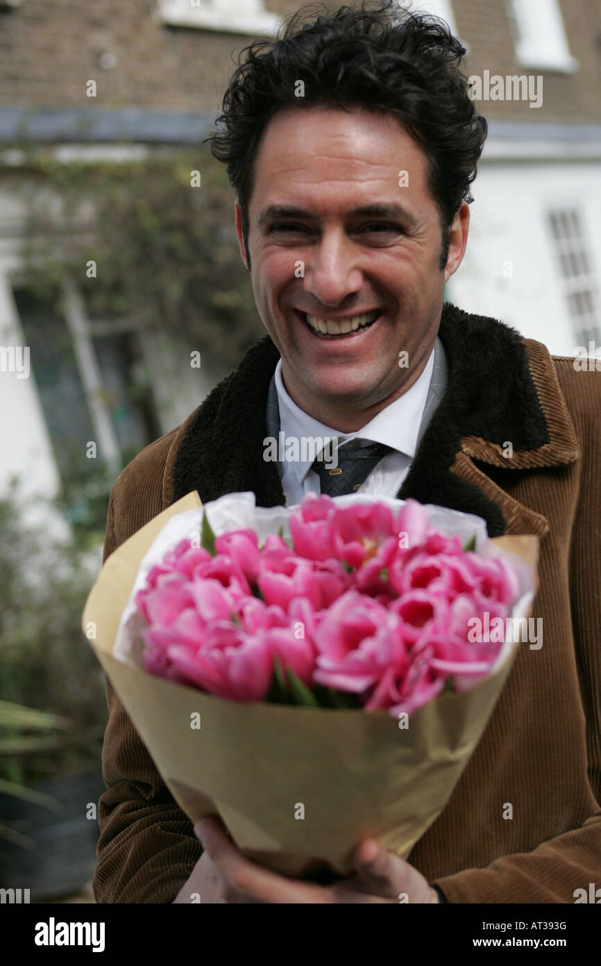 Un Uomo Sorridente Tenendo In Mano Un Mazzo Di Fiori Foto Stock Alamy