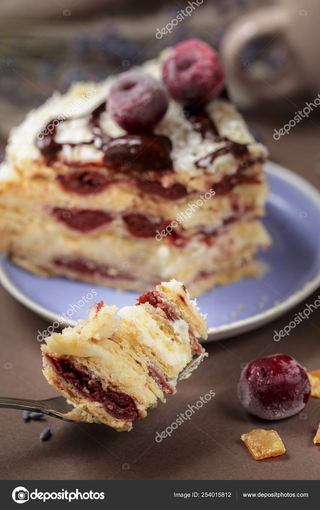 Delicious Summer Cherry Cake On A Purple Plate Stock Photo C Ansyvan