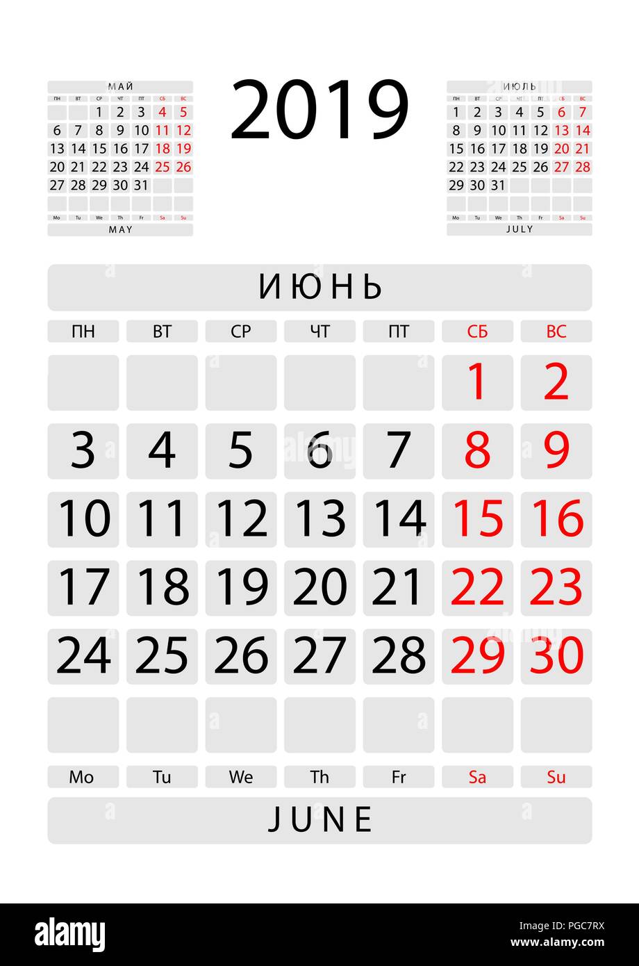 Foglio Di Calendario Per Il Mese Di Giugno 19 Con I Mesi Precedenti E Successivi Russo E Inglese Immagine E Vettoriale Alamy