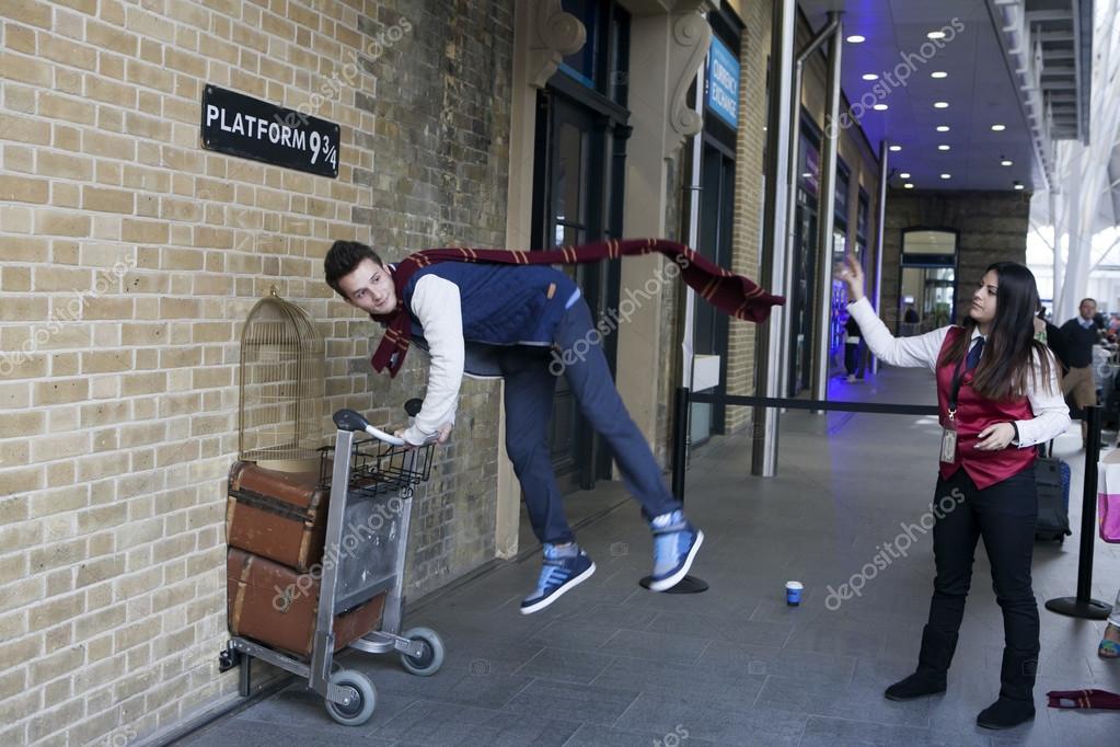 Picture Harry Potter And His Friends Kings Cross Station Wall Visited By Fans Of Harry Potter To Photograph Sign For Platform Nine And Three Quarters With Trolley Fun Jumping While His