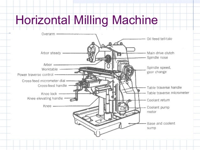 The metal must be held very firmly in a large machine vice, usually a nylon or leather mallet is used to hammer round the handle of the vice to ensure it is extremely tight QUESTIONS 1 Draw a diagram of a horizontal milling machine and label the important parts 2 Explain the term upmilling 3 What safety measures would you take before. Milling Machine is a machine tool that uses a multipoint cutting tool for removing a layer of material in the form of grooves from the surface of the workpiece Some Key Points on Milling Machine Machining of flat surfaces, Slots, pockets, keyways, and profile. English Diagram of a horizontal milling machine 1 Base 2 Column 3 Console 4 Transversal Carriage 5 Table 6 Bridge 7 Axis Tool.