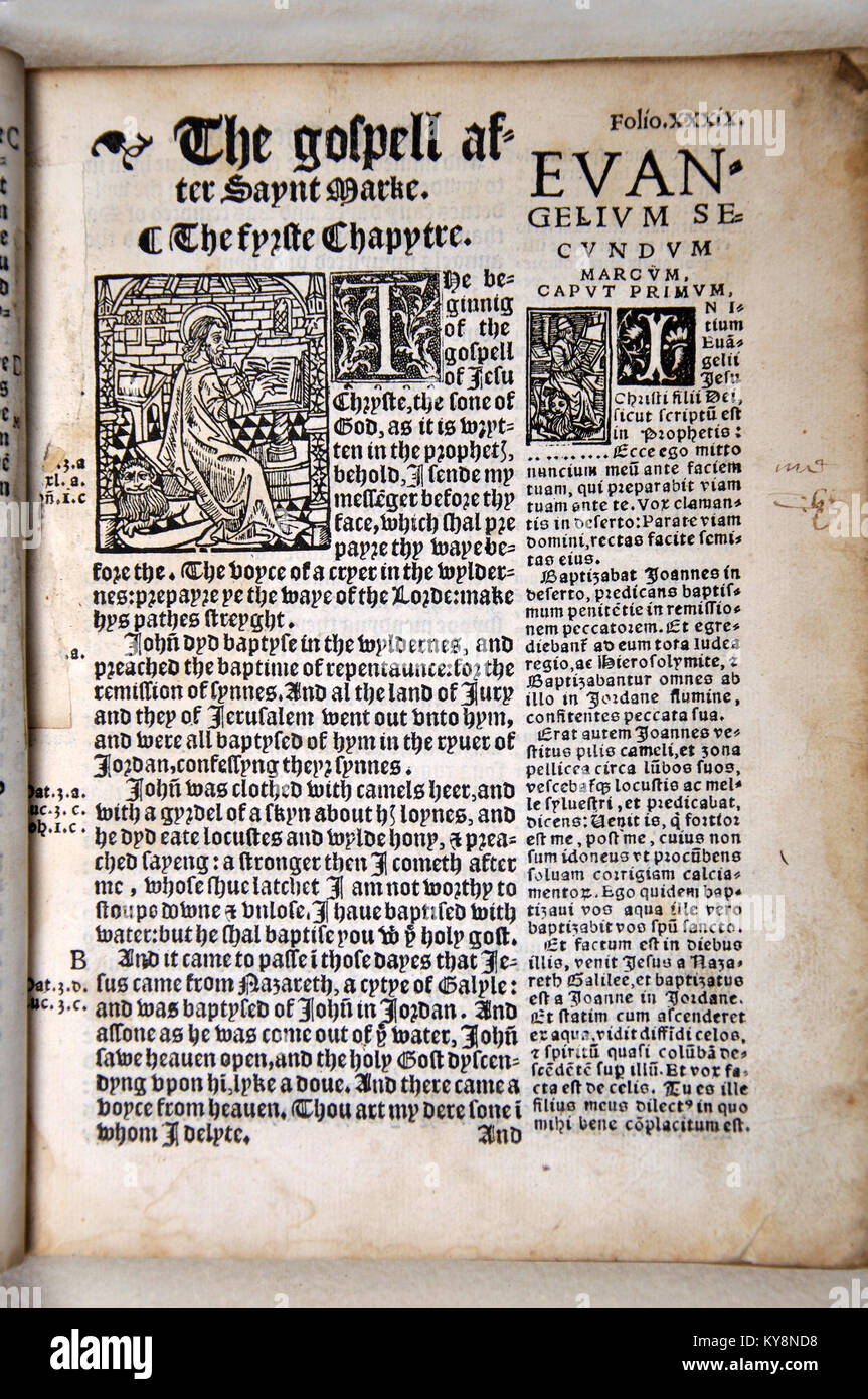 Titolo Pagina Del Vangelo Di Marco In William Tyndale S 1538 Edizione Del Nuovo Testamento Inglese Che Mostrava Il Testo In Inglese E Di Erasmus Testo Latino Dal Pettine Rara Collezione Di Libri