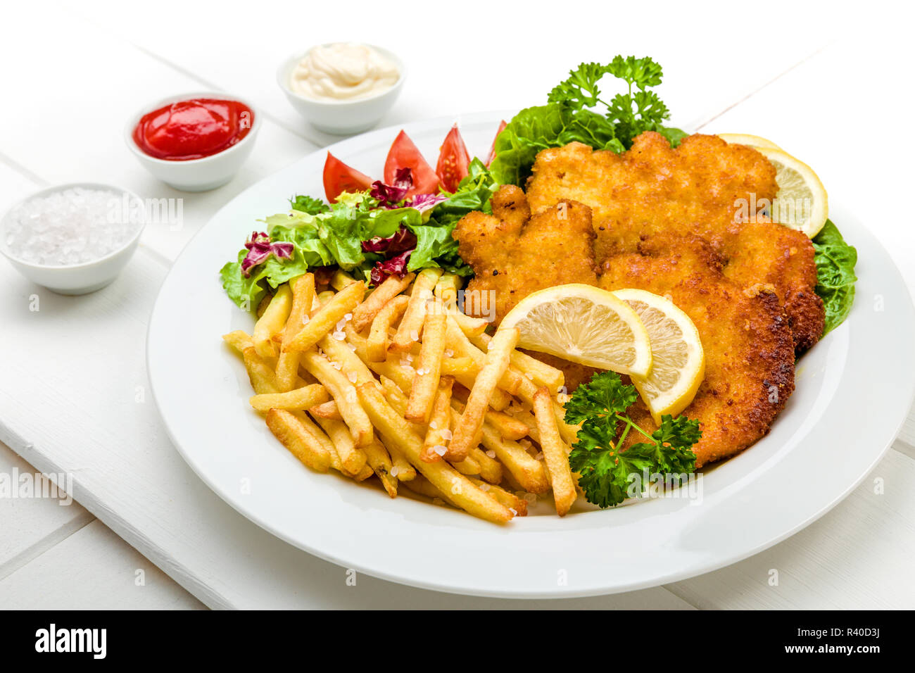Cotoletta Di Pollo Con Patatine E Insalata Mista Foto Stock Alamy