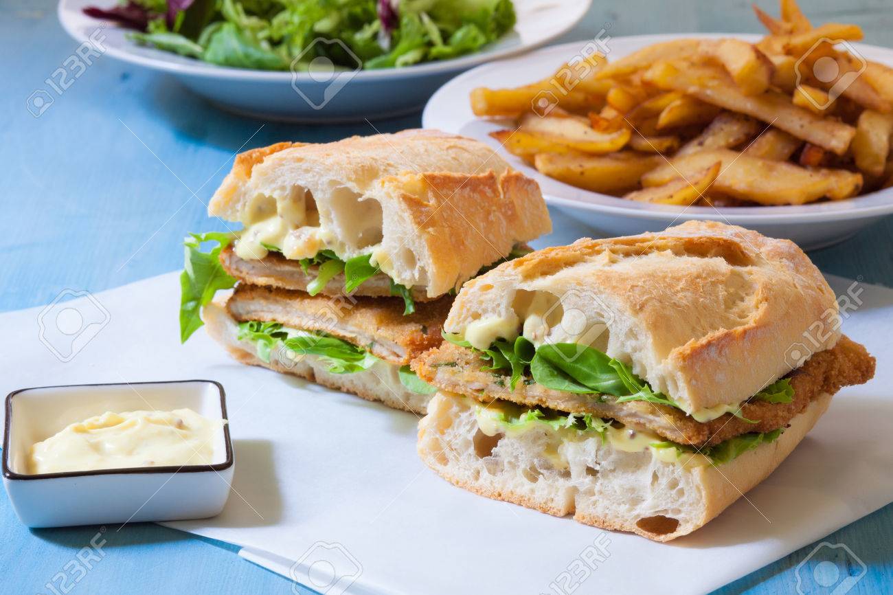 Immagini Stock Sandwich Di Pollo Impanato Con Patatine Fritte E Insalata Image