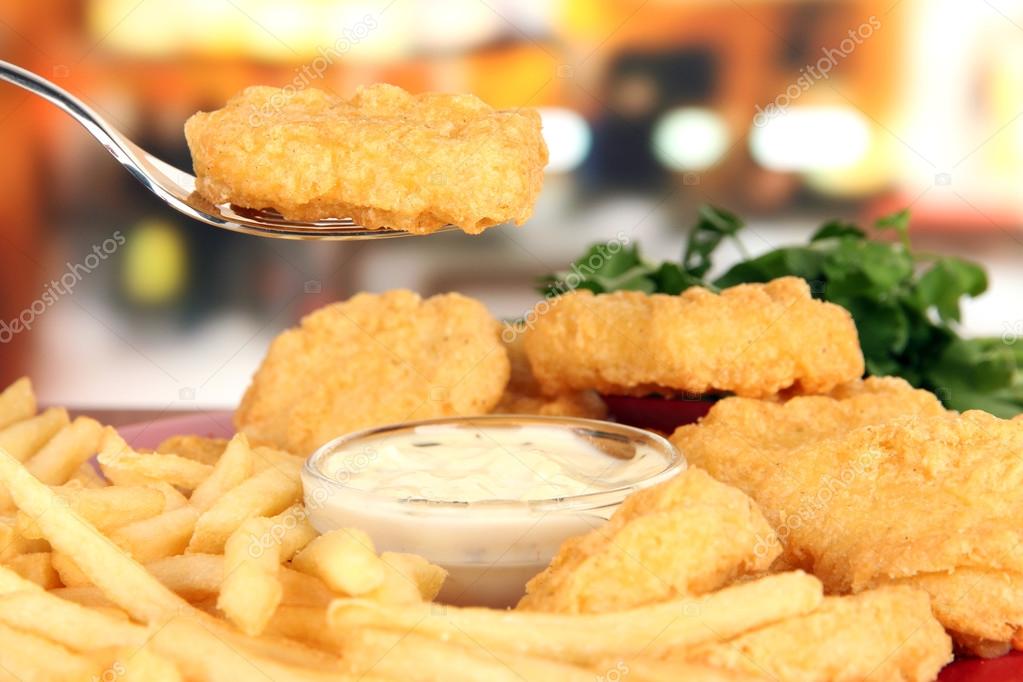 Pepite Di Pollo Fritte Con Patatine Fritte E Salsa Sul Tavolo Nel Caffe Foto Stock Foto Immagini C Belchonock Depositphotos