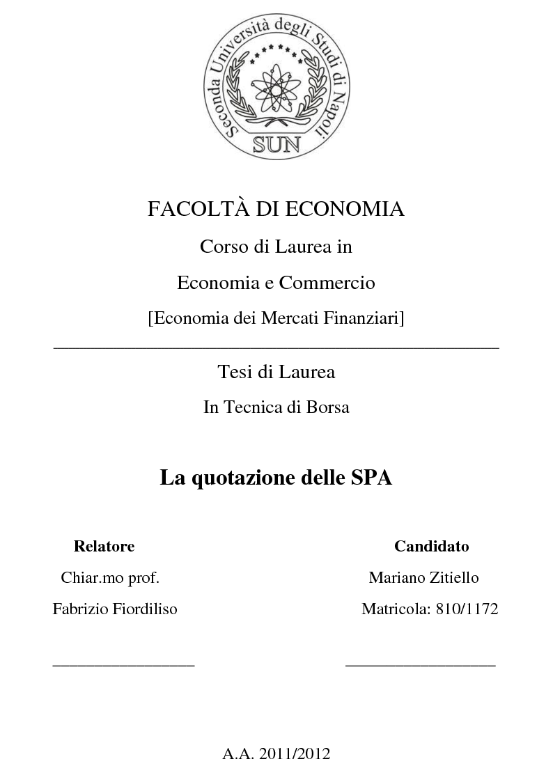Facolta Di Economia Corso Di Laurea In Economia E Commercio Economia Dei Mercati Finanziari Tesi Di Laurea In Tecnica Di Borsa La Quotazione Delle Spa Relatore Candidato Chiar Tesionline