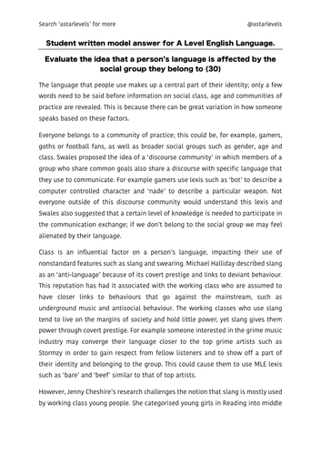 The introduction is where you set up your background and form your thesis statement, which is the main argument of your essay The introductory paragraph should not be too long, it needs to be concise but contain all the necessary information to provide a solid basis for the next stage of your essay. Top band, student written model answer for A Level English Language This essay demonstrates how to convey understanding of linguistic ideas by evaluating and challenging the views presented in the question and by other linguists Students of all abilities will benefit from an example of effective essay writing which they can emulate in their own work. Students had only 15 minutes to read the sources and 40 minutes to write;.