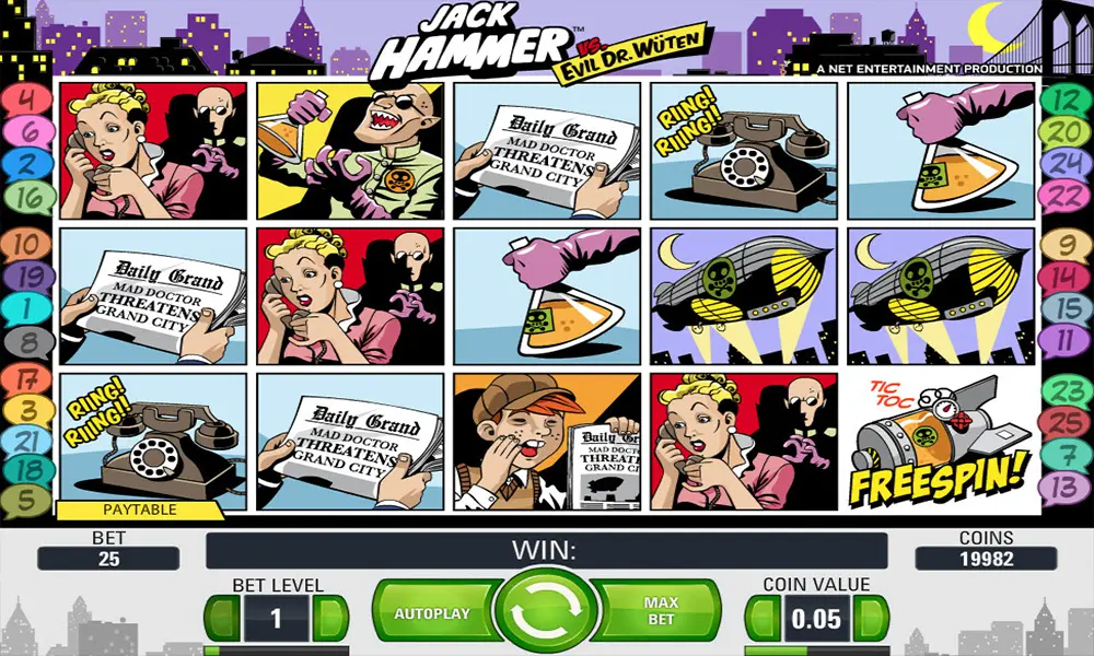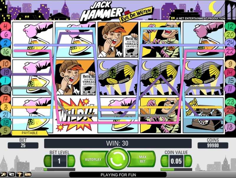 Jack Hammer 2 from Net Ent is a payline video slot set in a comic book land of an amateur sleuth A standout feature is the huge variety of ways to win the game offers, from an exciting sticky wins option to a scatter which triggers free spins that promise a treble payout bonus. Jack Hammer Slot Step back in time with NetEnt’s comic book styled video slot, Jack HammerDrawing inspiration from the trashy pulp fiction detective books that were so popular till the 1950s this slot machine sees you caught in the ongoing battle between the gritty detective Jack Hammer and his archnemesis, the evil Dr Wuten. Jack Hammer vs Evil Dr Wuten is a 5reel slot with 25 fixed paylines The fact that they are fixed means that you must play them all on every spin, however you can alter the amount of money you bet The lowest possible bet at this game is 025 coins, which might be slightly too high for really lowstakes players, while the maximum bet is a.