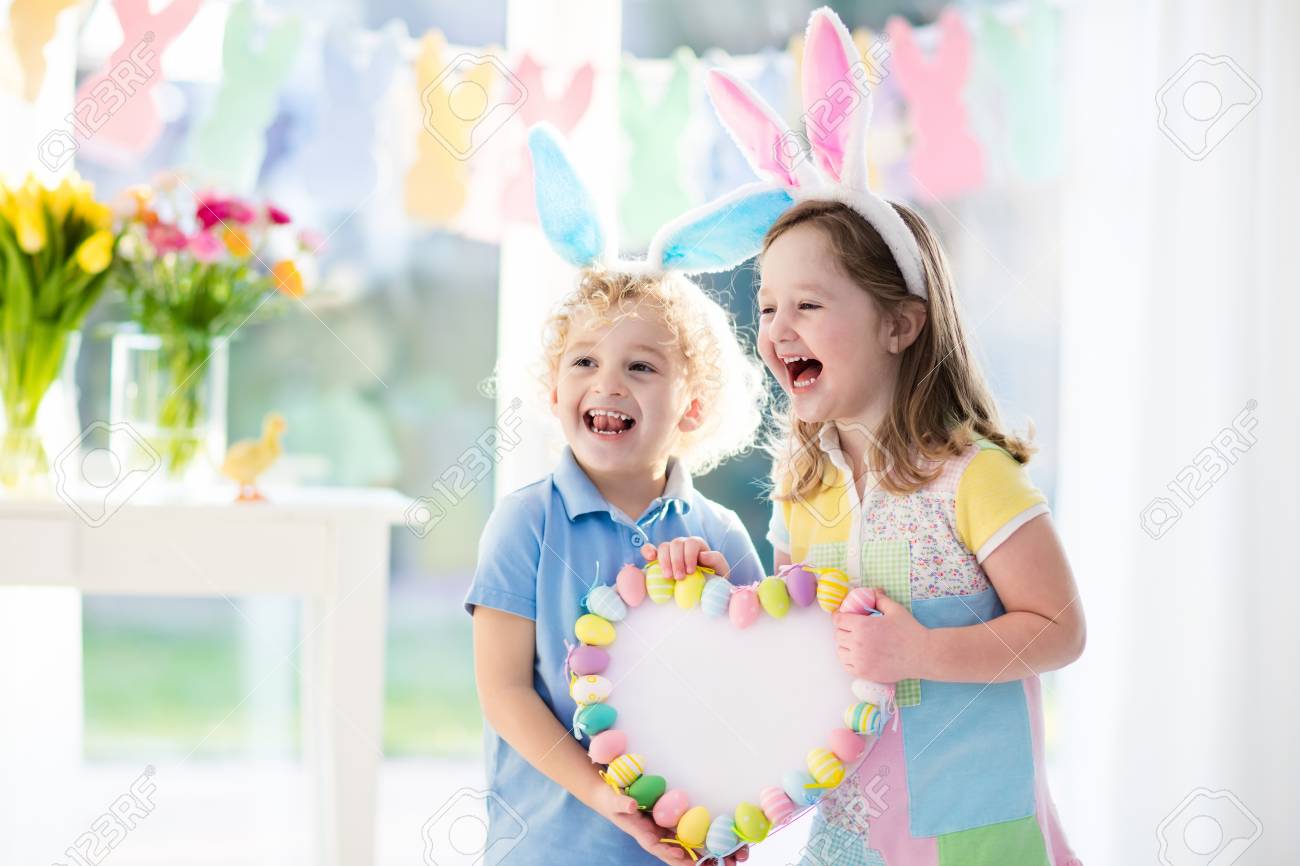Immagini Stock Ragazzino E Ragazza Nelle Orecchie Del Coniglietto Che Tiene Una Cornice Del Cuore Con Le Uova Di Pasqua Variopinte I Bambini Celebrano La Pasqua I Bambini Si Divertono A
