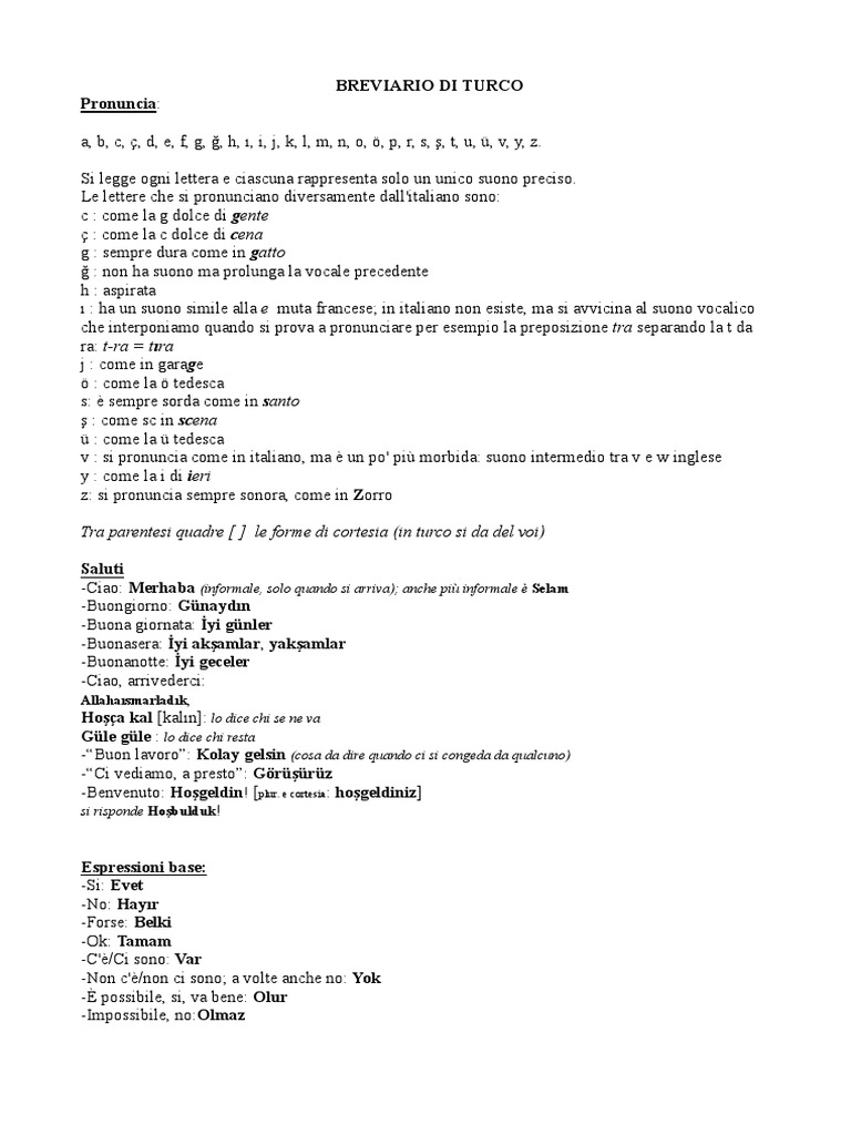 Dizionario turco La lingua turca è una delle lingue più ricche di fonetica al mondo Quasi tutte le vocali sono pronunciate come in Italiano Qui di seguito vengono riportate alcune consonanti aggiuntive e che si pronunciano diversamente, che non si trovano nell'alfabeto italiano la c pronunciata la g in "giornale" la g lunga, come l'h muta la s dura come la s in "rosso" la z dolce si. Come si dice ciao, grazie e buongiorno in turco?. Dimmelo in turco è un corso base di turco in lingua italiana per chi vuole iniziare o semplicemente farsi un’idea In questa lezione si tratta della pronunci.