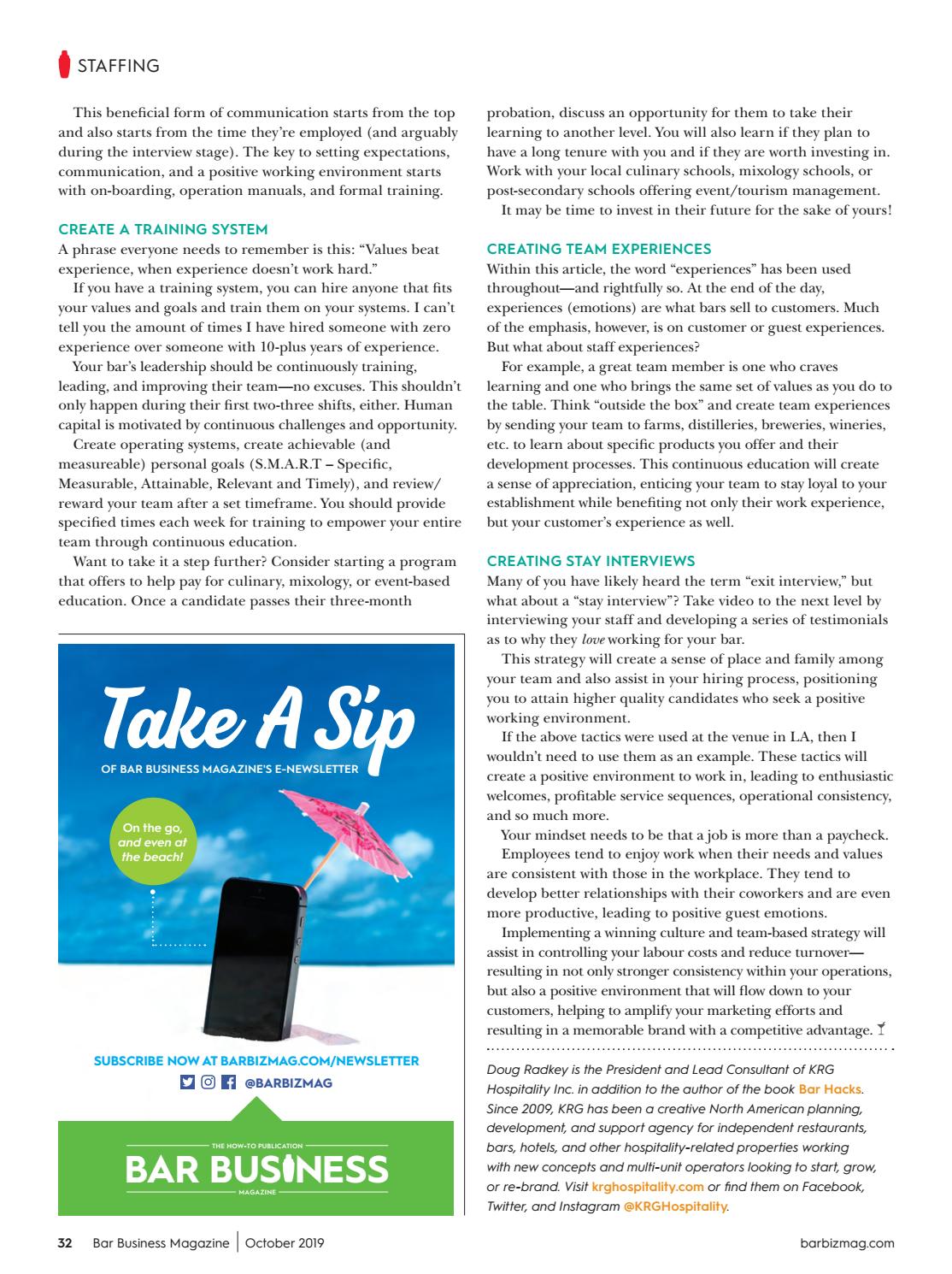Bar Business Magazine is the premier publicaton, in print and online, for owners and operators in the nightlife and hospitality industry Since 08, Bar Business has been providing owners, operators, and managers the opportunity to find out what is going on in the nightlife industry, and more importantly, how to benefit from it all and better their own business. Frequency 6 Issues/yr Price $2195/yr Read Online iTunes and Google Play While this one is admittedly not designed primarily for bartenders, Imbibe Magazine is all about drinks It’s beautifully produced, looks nice enough to keep a collection on your bookshelf, and every issue comes with great wellresearched stories about great drinks, new ingredients, and interesting people in the. Title Bar Business August/September , Author Bar Business Magazine, Name Bar Business August/September , Length 48 pages, Page 36, Published 0914 Issuu company logo Issuu.