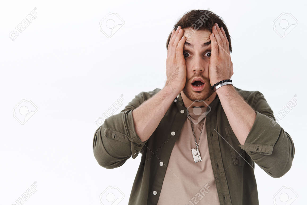 Oh My Gosh Wtf Shocked And Alarmed Man In Panic Grab Face Sqeeze Stock Photo Picture And Royalty Free Image Image