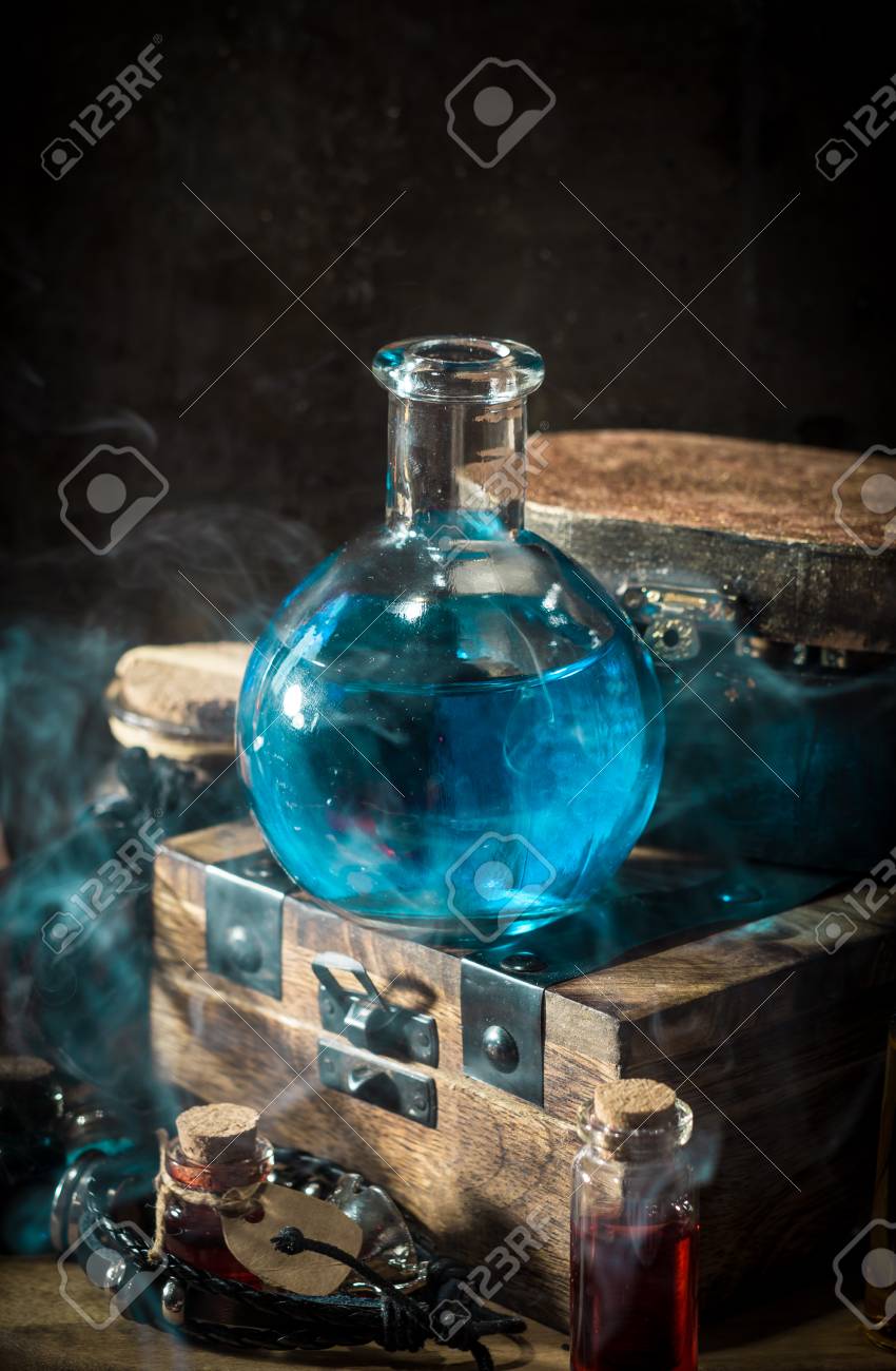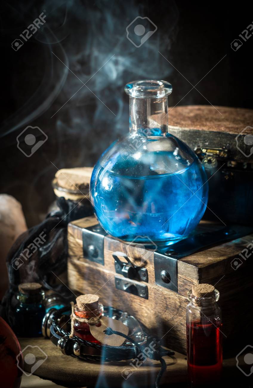 Blue Magic Potion With Smoke Magical Concept With Wooden Box Stock Photo Picture And Royalty Free Image Image
