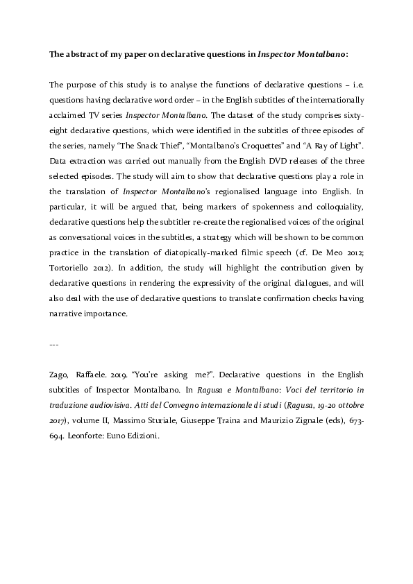 Pdf You Re Asking Me Declarative Questions In The English Subtitles Of Inspector Montalbano Abstract Raffaele Zago Academia Edu