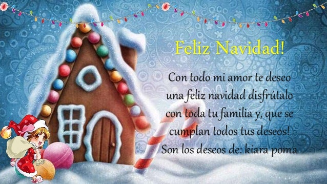 Estás en mi corazón y en mi espíritu esta Navidad y siempre Eres la única persona en la que estoy pensando en esta ocasión festiva Gracias por llenar mi vida de felicidad y amor ¡Feliz Navidad!. 27dic19 Explora el tablero de Jessy "Feliz navidad mi amor" en Ver más ideas sobre feliz navidad mi amor, frases bonitas, sé bueno. Frases de Feliz Navidad para mi amor es lo que estas buscando?Esta fecha tan especial como la Navidad es para disfrutar con nuestros seres amados y compartir bellos momentos en unión y amor En esta Navidad no debemos preocuparnos por los regalos o por un vistoso árbol Navideño, pues el verdadero sentido de esta fecha es que abunden en nuestros corazones los mejores sentimientos para.