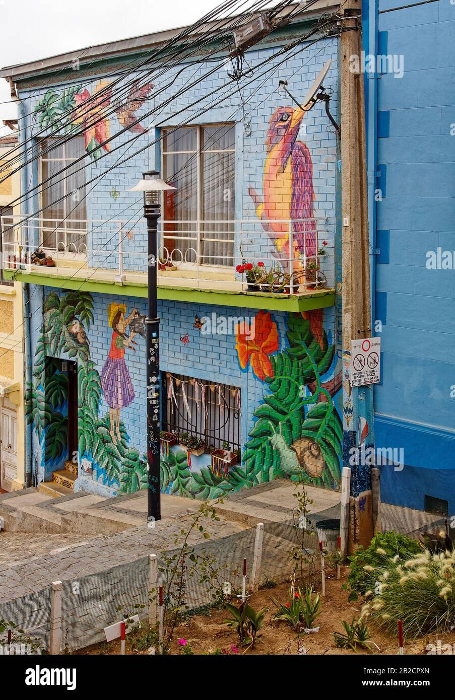 House Building Murals Brightly Colored Public Art Steep Street Lamppost Electric Wires Unesco Valparaiso Chile South America Summer Stock Photo Alamy