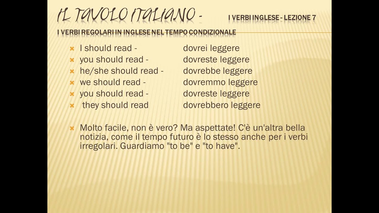 Il condizionale in inglese, temuto, antipatico a tutti e mai studiato come si dovrebbe Perché mai gli inglesi si siano dovuti mettere ad inventarlo non si è ancora capito Non sono nemmeno uno o due, ma quattro!. Il condizionale presente corrisponde all'inglese would verbo, ed è formato dal tema del futuro e l'aggiunta delle desinenze proprie del condizionale parlare parler leggere legger sentire sentir io ei tu esti lui/lei ebbe noi emmo voi este loro ebbero. Il condizionale Condizionale presente Si forma per la prima persona (singolare e plurale) con would/should infinito presente e per tutte le altre persone con would infinito Alcuni esempi sono I would eat/I should eat tooltip vorrei mangiare / dovrei mangiare/tooltip You would eat tooltip mangeresti/tooltip.