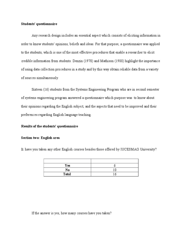 Esp Need Analysis Questionnaire For University Students English Language English As A Second Or Foreign Language