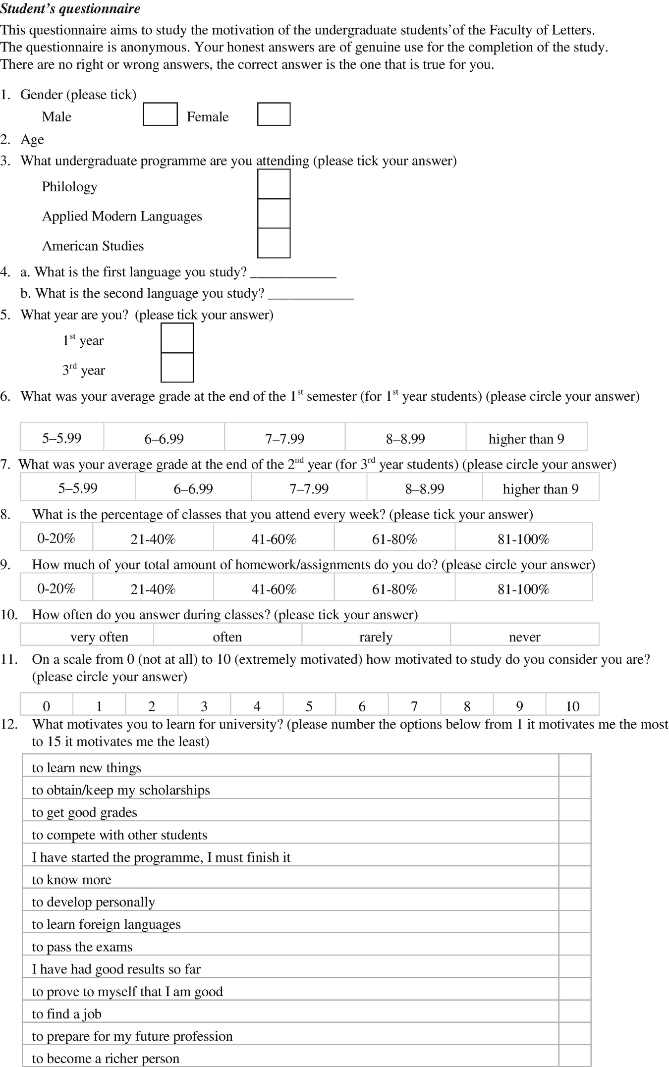 ___YES ___NO 2 If you responded yes to question #1, which language(s) do you speak?. Undergraduate students at SIIT, Thammasat University and to determine if they are more integratively or instrumentally motivated English language learning 13 Research questions The research study was conducted to survey the first year undergraduate students in the second semester, academic year 12 in particular. Student survey samples require to be very clear and obvious with the questions because many a times there are chances that the students may miss the gist of the question and misinterpret it thus going on to answer something completely unrelated or non useful However the questions also need to be a little subtle so that the students don’t find it odd or weird to fill out some information.
