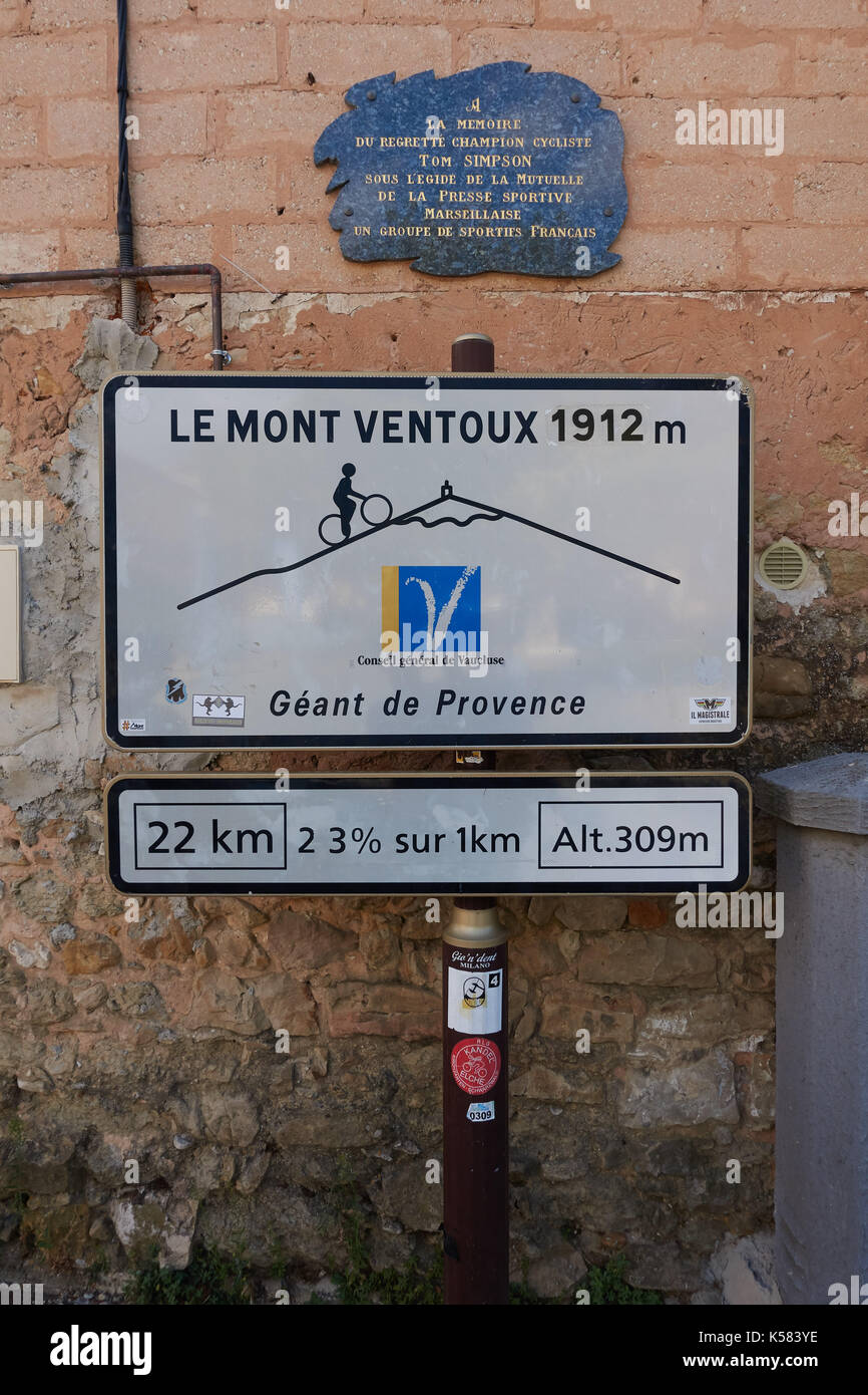 Cartello In Bedoin Francia Segna L Inizio Di Escursioni In Bicicletta La Salita Del Mont Ventoux Foto Stock Alamy