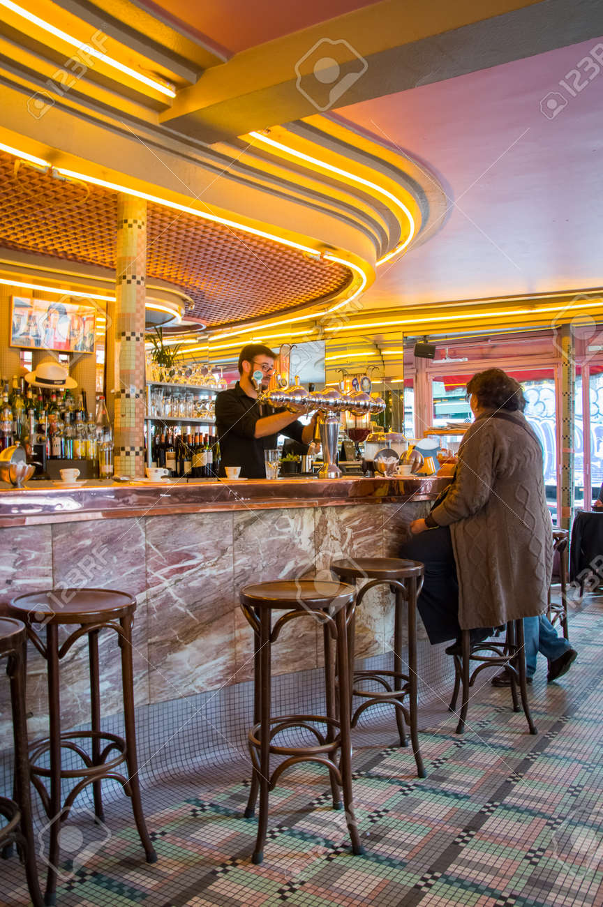 Immagini Stock Una Donna Sconosciuta E Seduta Al Bancone Del Bar Del Cafe Des 2 Moulins Francese Per Image