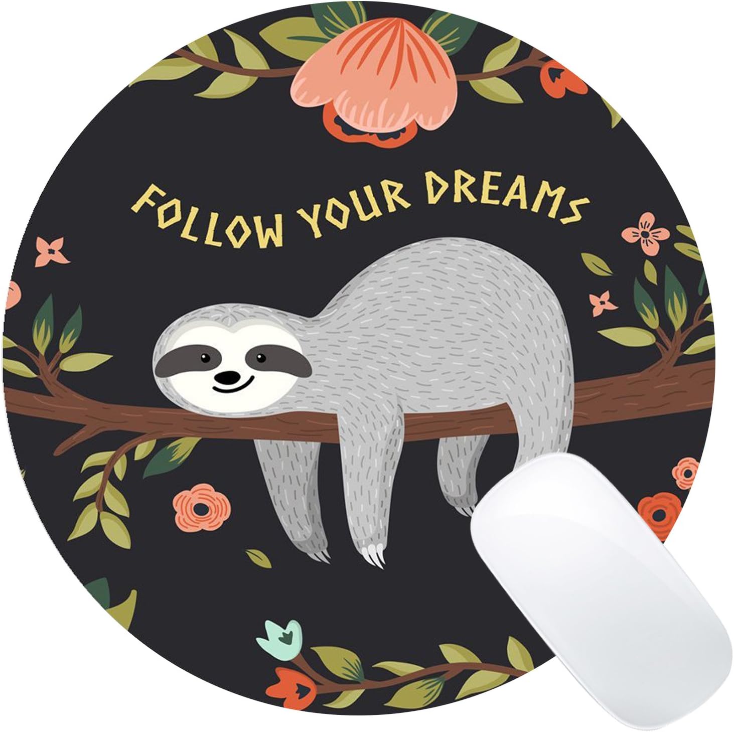Wknoon Cute Baby Sloth Inspirational Quotes Round Mouse Pad Follow Your Dreams Quote Sloth On The