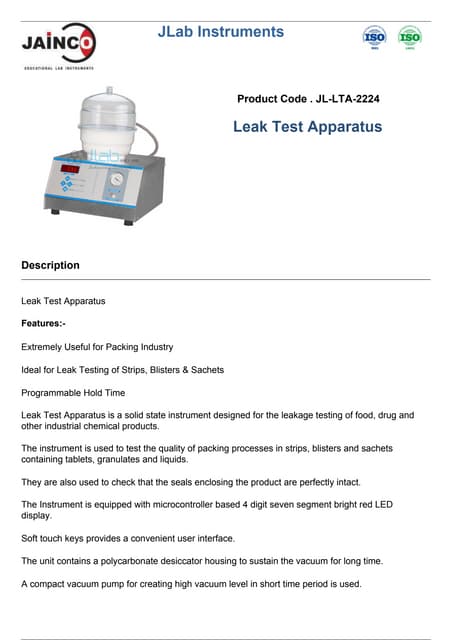 Leak Test Apparatus Campbell Electronics has been pioneers in Test Lab Instruments for pharmaceutical Industries Our emphasis has been on the continuous development & upgrading the product using latest technology to make instruments more accurate & user friendly Model PIT 10 is result of our commitment to give economical, fully calibrated solution in quality assurance for tablet testing. To lay down the procedure for operating leak seal test apparatus SCOPE This SOP shall be applicable to Quality Control Dept 30 RESPONSIBILITY Supervisor QC 40 ACCOUNTABILITY Head Quality Assurance 50 PROCEDURE 51 Ensure the cleanliness of the area and the equipment. Leak Test Apparatus Hindustan Apparatus Mfg Company Voltage (V) 2 Accumax India Model Number 1961 Esico International Infinity Automation Systems Private Limited Call Leak Test Machine is an ideal instrument to check the Analab Scientific Instruments Private Limited.