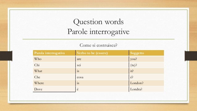 Simple present Present continuous Past Continuous Sinple past Present perfect Past Perfect Present perfect continuous e Futuro. Aprende inglés con el método Vaughan Elige el programa que mejor se adapte a ti clases presenciales para niños, jóvenes y adultos, curso online, inmersiones en España, inmersiones en el extranjero, clases 24 horas al día en. Le parole interrogative occupano di solito il primo posto nella frase Who corrisponde all'italiano "chi" e si usa in riferimento alle persone.