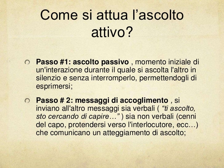 Esercizio di ascolto inglese 1 Introduzione personale di Simonetta In questa prima esercitazione di ascolto inglese ti voglio introdurre brevemente chi sono in inglese Scopri di più. L’ascolto attivo è la capacità di ascoltare la persona che si ha davanti con un alto grado di attenzione e di partecipazione emotiva e comunicativa Differisce dall’ascolto passivo in quanto non si limita alla sola ricezione di informazioni. In quale misura l’ascolto attivo è la strategia fondamentale per aumentare la compliance del paziente anziano gli atteggiamenti fondamentali da mettere in atto per una comunicazione efficace rischi del non ascolto nella relazione con il paziente.