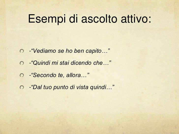 Assumere un atteggiamento attivo e fiinalizzato all’ascolto nelle diverse situazioni Comunicative Comprendere i contenuti principali dei messaggi orali Riflettere sull’importanza di attivare comportamenti relazionali positivi Una prima attività utile è guidare una conversazione al fine di conoscere le idee dei bambini sui. Perché l’ascolto attivo promuove la cooperazione invece del conflitto Promuove il dialogo che esprime il nostro bisogno di “esserci” attraverso le dimensioni fisicoenergetica, emotiva, razionale e spirituale Crea le condizioni affinché le relazioni possano alimentarsi non solo nella simpatia, ma anche nella discordanza e. Ascolto attivo esercizi ed esempi Normalmente, non siamo abituati ad ascoltare attivamente gli altri e pensiamo che solo perché siamo presenti quando qualcuno ci sta comunicando qualcosa e quando ascoltiamo ciò che ci dice, lo stiamo ascoltando come dovrebbe e non è così 6 esercizi di ascolto attivo.