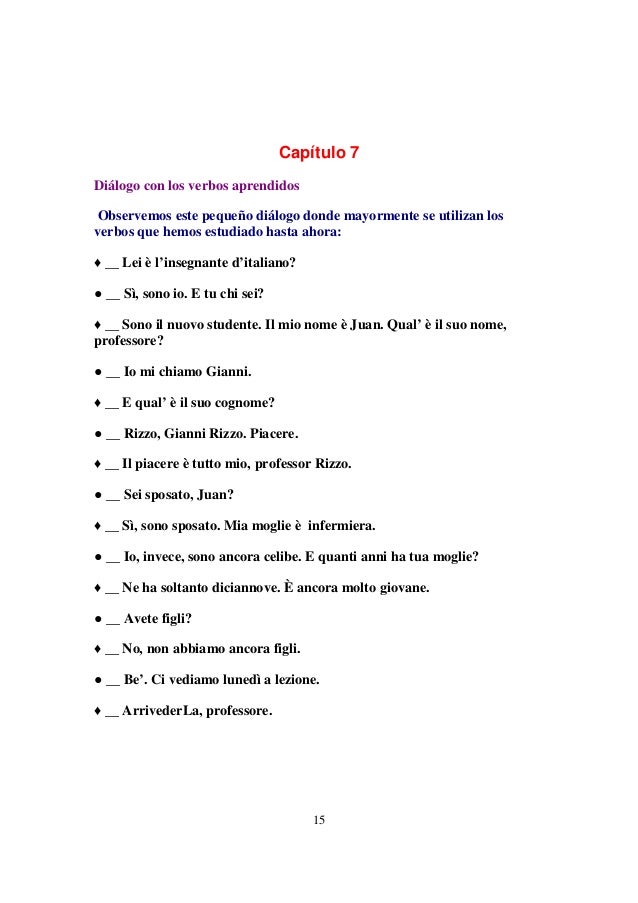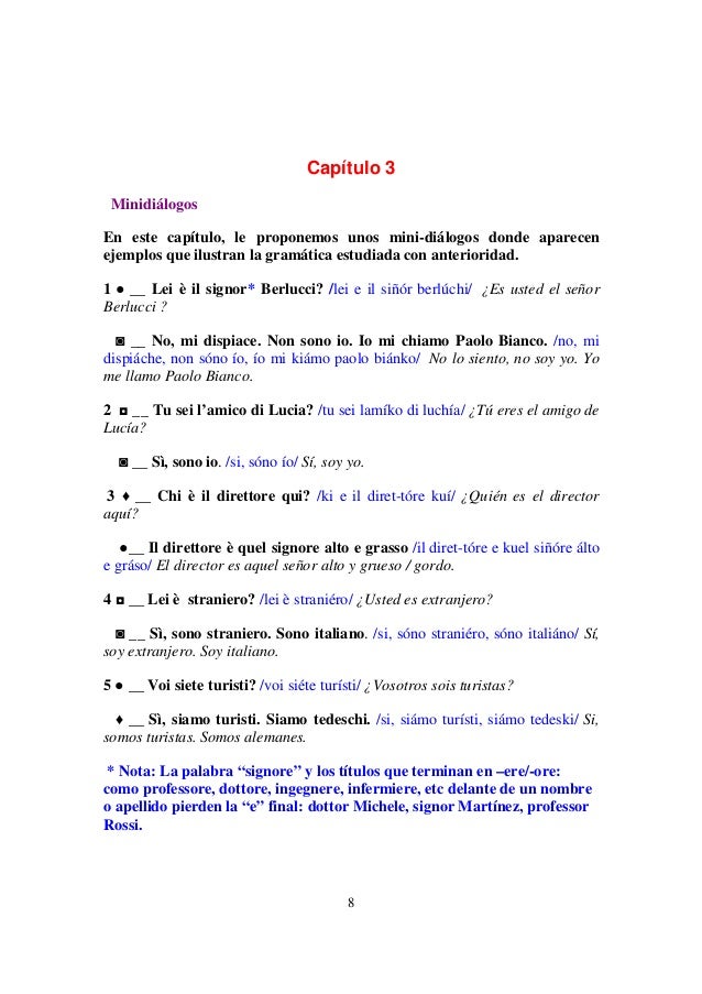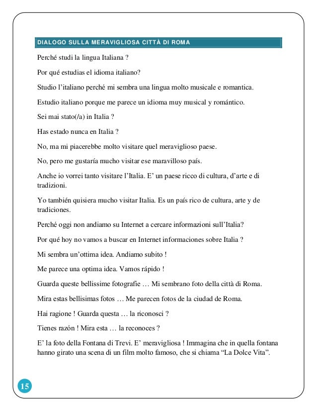Conversação em italiano, diálogo formal e informal Todos querem aprender a conversar, então vamos lá!. En el caso de realizar un curso intensivo de lengua italiana el alumno se encontrará con un profesorado compuesto totalmente por profesores nativos italianos La ventaja de tener un profesor nativo está en el manejo de las clases por parte del docente única y exclusivamente en lengua italiana, lo que conlleva un intercambio frecuente de diálogos en italiano y una práctica continua. Traducciones en contexto de "diálogos" en españolitaliano de Reverso Context diálogos a tres bandas, diálogos políticos, diálogos sobre.