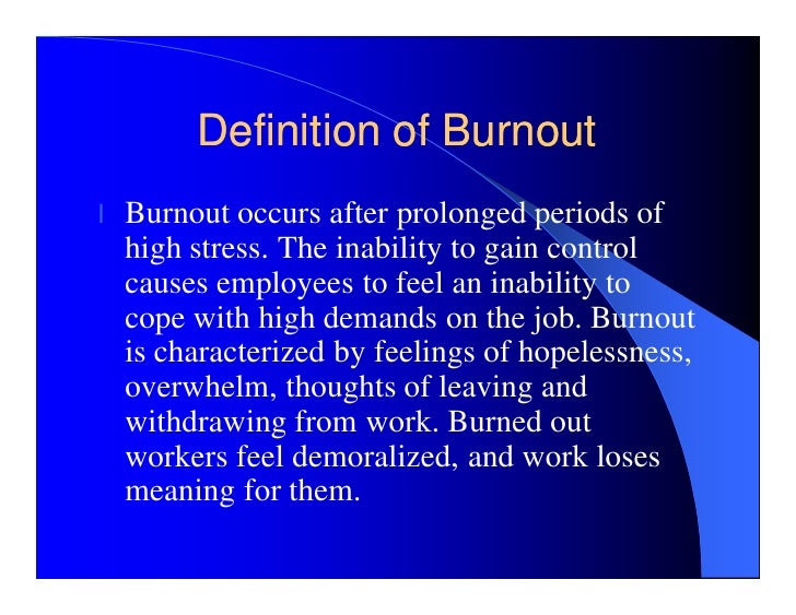 ‘a burnedout undercover cop’ ‘She had died at the age of 45 from exhaustion, burnt out by the hardships of life’ ‘But for a burned out cop like Mitch, it was just what the proverbial doctor had ordered’. Burnout bern´out emotional and physical exhaustion resulting from a combination of exposure to environmental and internal stressors and inadequate coping and adaptive skills In addition to signs of exhaustion, the person with burnout exhibits an increasingly negative attitude toward his or her job, low selfesteem, and personal devaluation. Are you dreading the gym lately?.