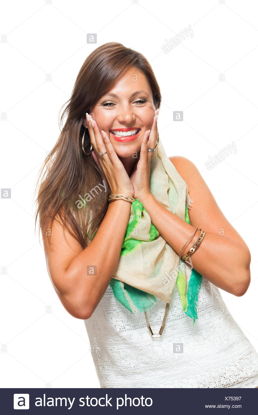 Donna Felice Nel Quartiere Alla Moda Di Outfit Toccando Il Suo Volto Foto Stock Alamy
