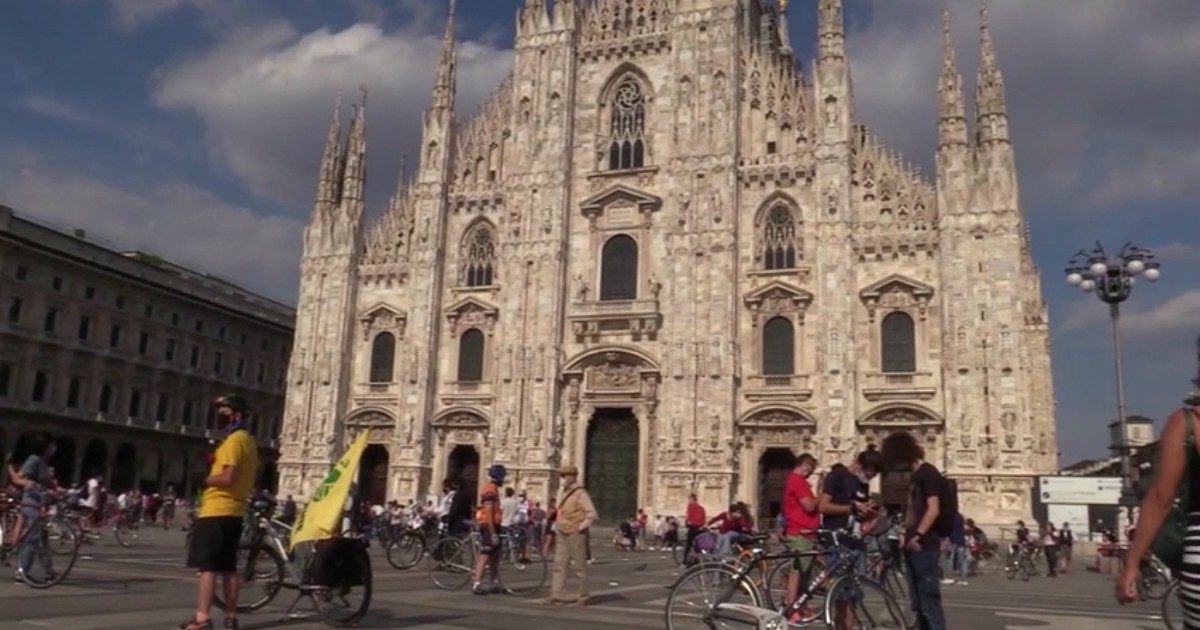 Milano Il Flashmob In Piazza Duomo Con 400 Ciclisti Nel Giorno In Cui Sarebbe Dovuto Arrivare Il Giro D Italia Chiediamo Citta A Misura Di Bici Il Fatto Quotidiano