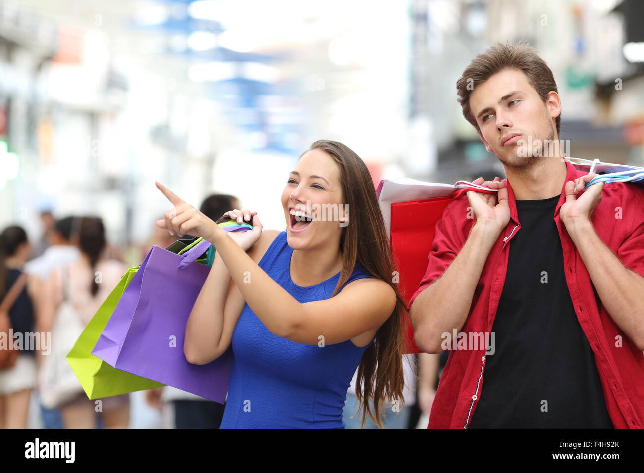 Annoiato Uomo A Fare Shopping Con La Sua Fidanzata In Una Strada Commerciale Foto Stock Alamy