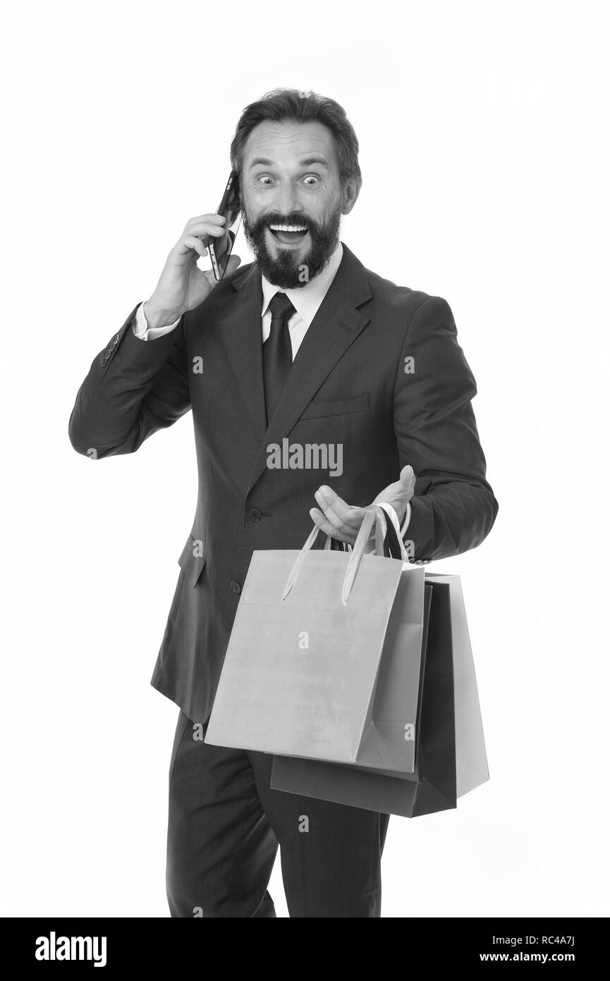 L Uomo Fare Acquisti Su Internet Utilizzando Lo Smartphone Uomo Con Sacchetti Di Carta Comprare E Vendere Online Fare Business Online E Cosi Facile Navigare In Rete Per Il Business E Lo Shopping