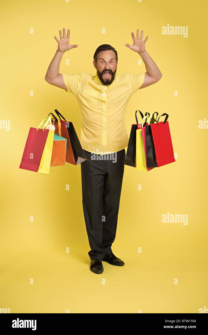 Paura Di Fare Shopping Colli Completi Di Articoli L Uomo Con La Faccia Pazza Indossa Un Toro Con Le Corna Hipster Dipendente Dall Immagine Stock Immagine Di Sacchetto Compratore