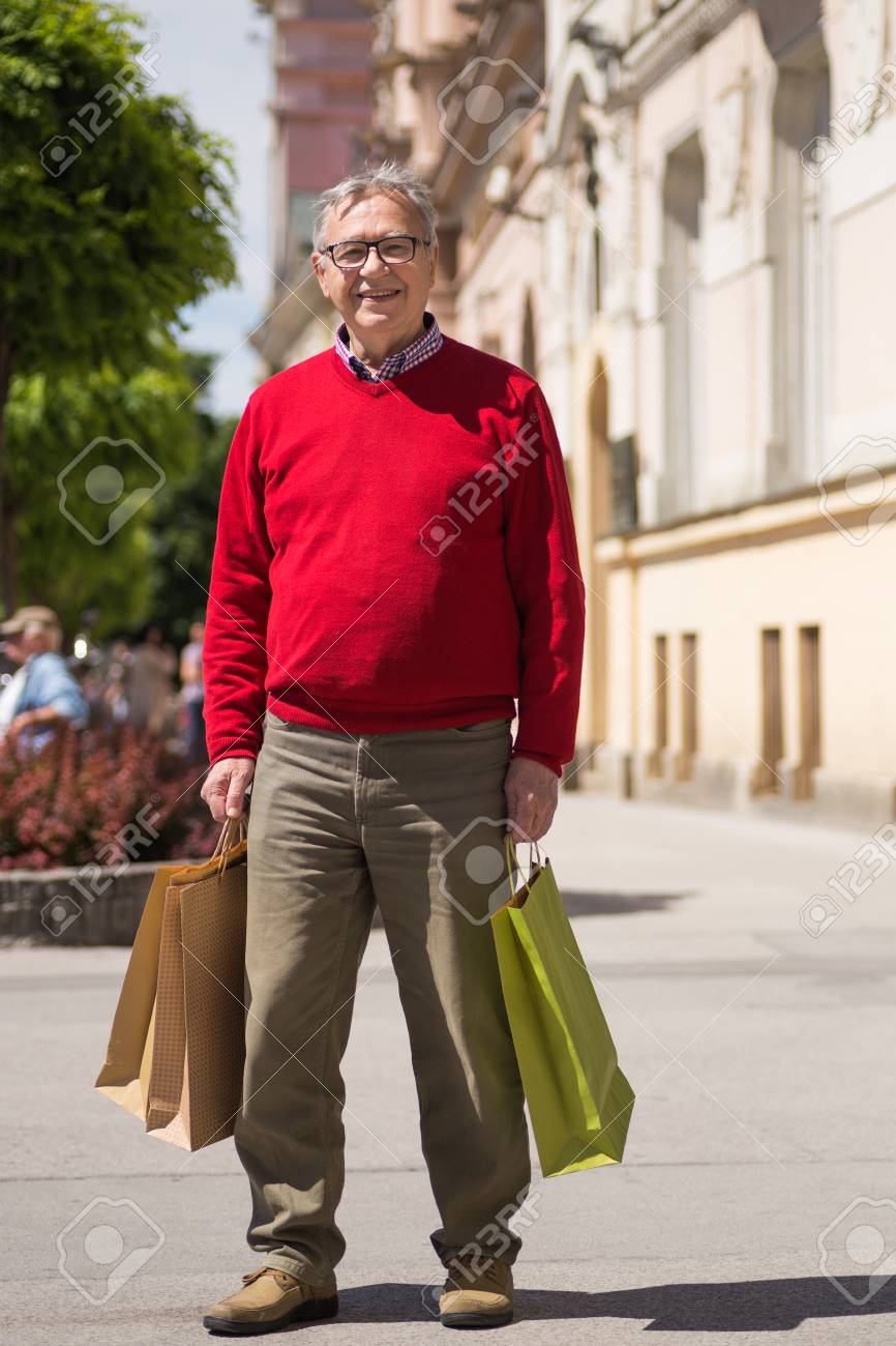 Immagini Stock L Uomo Anziano Gode Di Fare Shopping In Citta Image