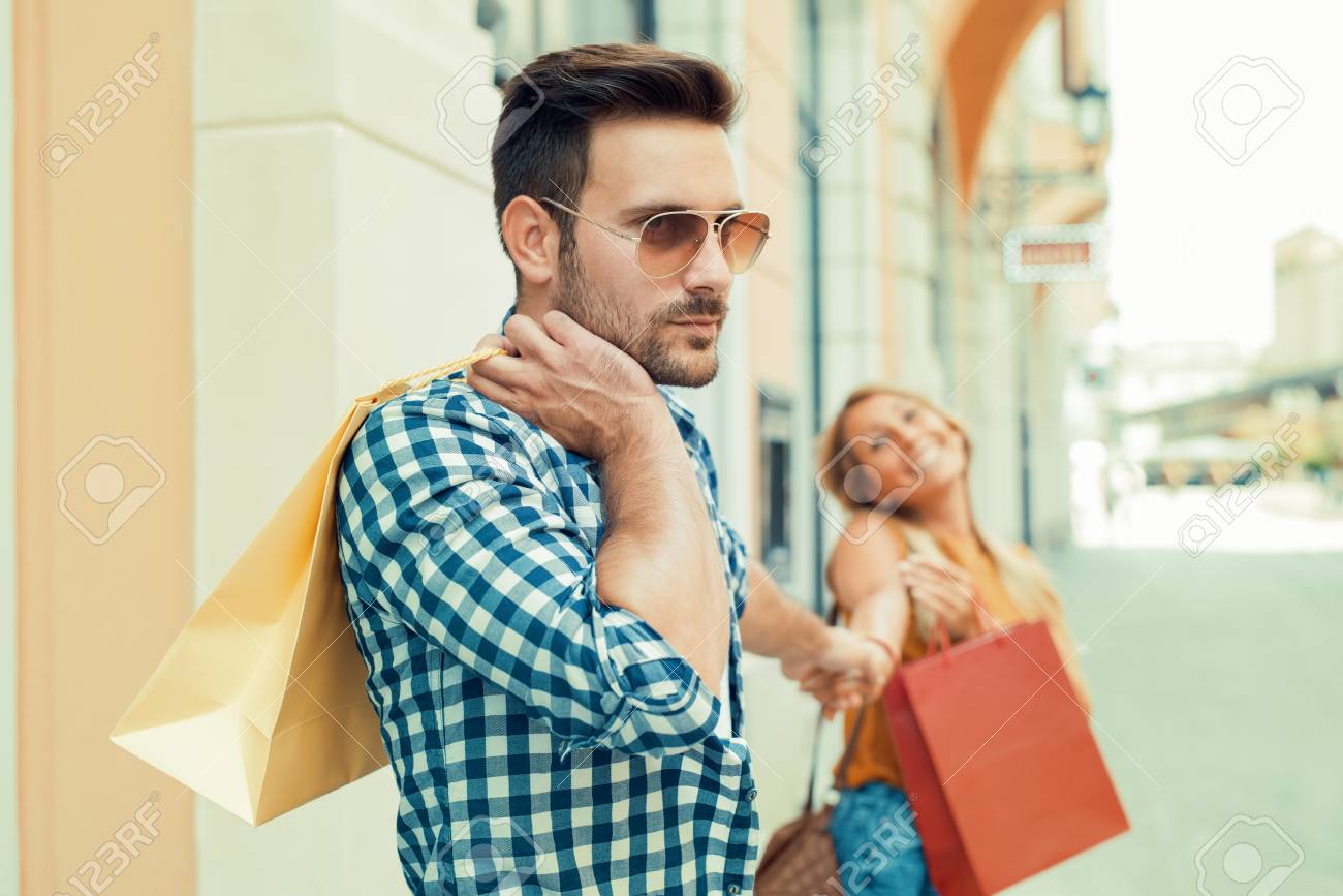 Immagini Stock Uomo Annoiato A Fare Shopping Con La Sua Ragazza In Citta Image