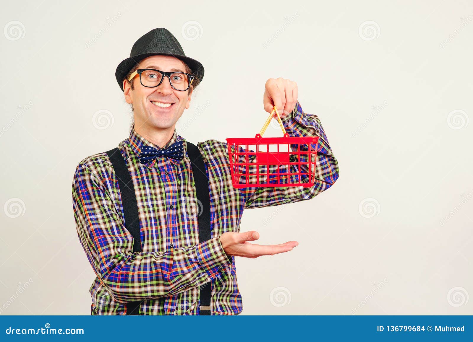 Uomo Divertente Con Cappello E Camicia In Camicia Con Il Cestino Del Supermercato Rosso Uomo A Fare Shopping Isolato Su Bianco C Fotografia Stock Immagine Di Scelta Mercato
