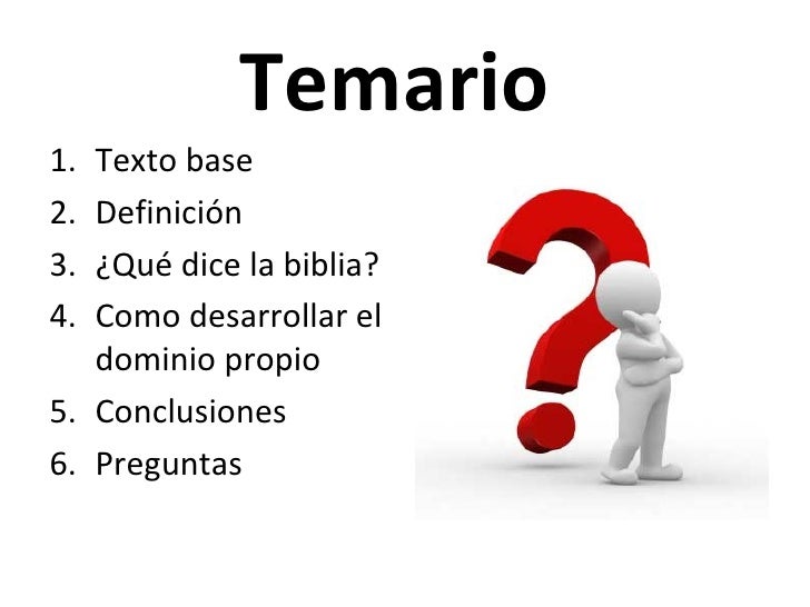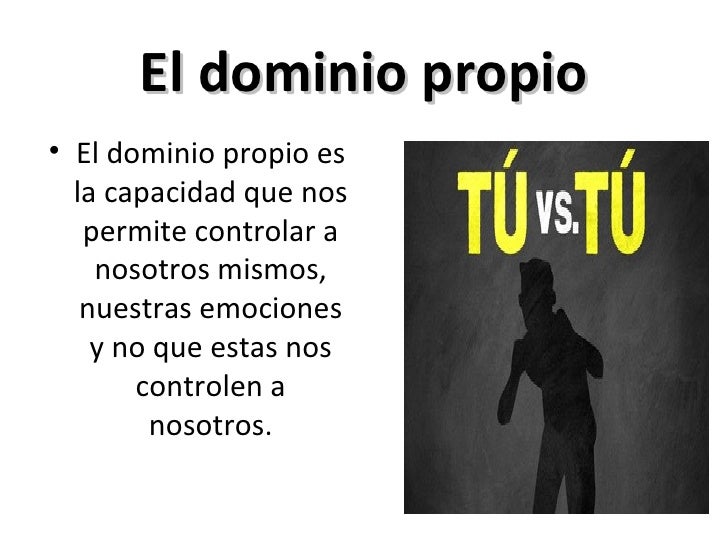 2 Timoteo 1711 ReinaValera 1960 (RVR1960) 7 Porque no nos ha dado Dios espíritu de cobardía, sino de poder, de amor y de dominio propio 8 Por tanto, no te averguences de dar testimonio de nuestro Señor, ni de mí, preso suyo, sino participa de las aflicciones por el evangelio según el poder de Dios, 9 quien nos salvó y llamó con llamamiento santo, no conforme a nuestras obras, sino. La Biblia dice en Proverbios 2528 “Como ciudad derribada y sin muro es el hombre cuyo espíritu no tiene rienda” El dominio propio es la capacidad de poder controlarse en todos los aspectos de su vida, aún cuando la naturaleza pida que sus deseos y apetitos se les de rienda suelta, esta persona es capaz de auto controlarse. Porque no nos ha dado Dios espíritu de cobardía, sino de poder, de amor y de dominio propio Proverbios 1632 (RVR60) Mejor es el que tarda en airarse que el fuerte;.