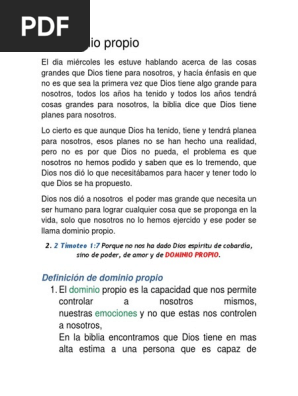 2 Timoteo 1711 ReinaValera 1960 (RVR1960) 7 Porque no nos ha dado Dios espíritu de cobardía, sino de poder, de amor y de dominio propio 8 Por tanto, no te averguences de dar testimonio de nuestro Señor, ni de mí, preso suyo, sino participa de las aflicciones por el evangelio según el poder de Dios, 9 quien nos salvó y llamó con llamamiento santo, no conforme a nuestras obras, sino. El Dominio Propio “Todas las cosas me son licitas, mas no todas convienen;. De hecho, el dominio propio es una de las cualidades que el Espíritu Santo produce en la vida de un creyente (Gálatas ) Cuando no estamos viviendo en moderación, cuando nos falta el dominio propio en cierta área de nuestras vidas, puede indicar que no estamos dejando que Dios llegue plenamente en esa área.