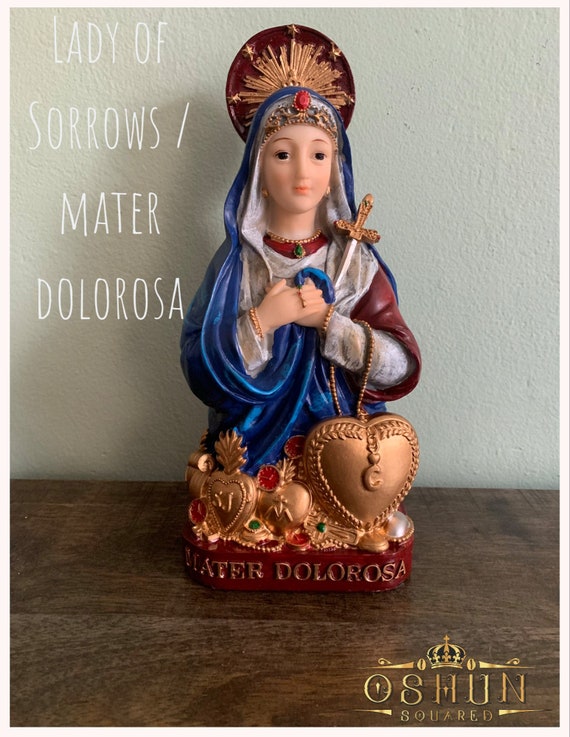 Our Lady’s promises to those who pray the Seven Sorrows Rosary, according to Marie Claire’s visions 1) With the recitation of the Seven Sorrows Rosary, the hardest hearts shall change, if you pray it for yourself or for others 2) By the recitation of the Seven Sorrows Rosary, you shall be freed from obsessions and addiction. Share Our Lady of Seven Sorrows Statue Mater Dolorosa Blessed Virgin Mary CURRENTLY SOLD OUT Our Lady of Seven Sorrows Statue Mater Dolorosa Blessed Virgin Mary 50 out of 5 stars 2 product ratings 50 average based on 2 product ratings 5 2 users rated this 5 out of 5 stars 2 4. Home > Blessed Mother Statues > Our Lady of Sorrows 8 Inch Statue Price $ You'll earn 400 points with myWoodington's Rewards This Item Ships within 35 Weeks Product Code ID Qty Product Description Order by Phone or Live Chat Shipping & Returns.