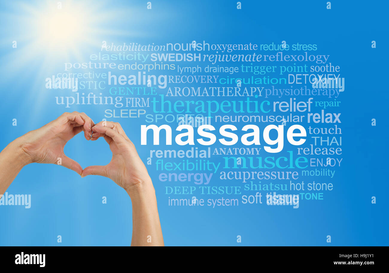 Mani Femminili Messa A Forma Di Cuore Con Una Parola Di Massaggio Nuvola Sulla Destra Cielo Blu Di Sfondo E Bright Sun Burst Nell Angolo In Alto A Sinistra Foto Stock