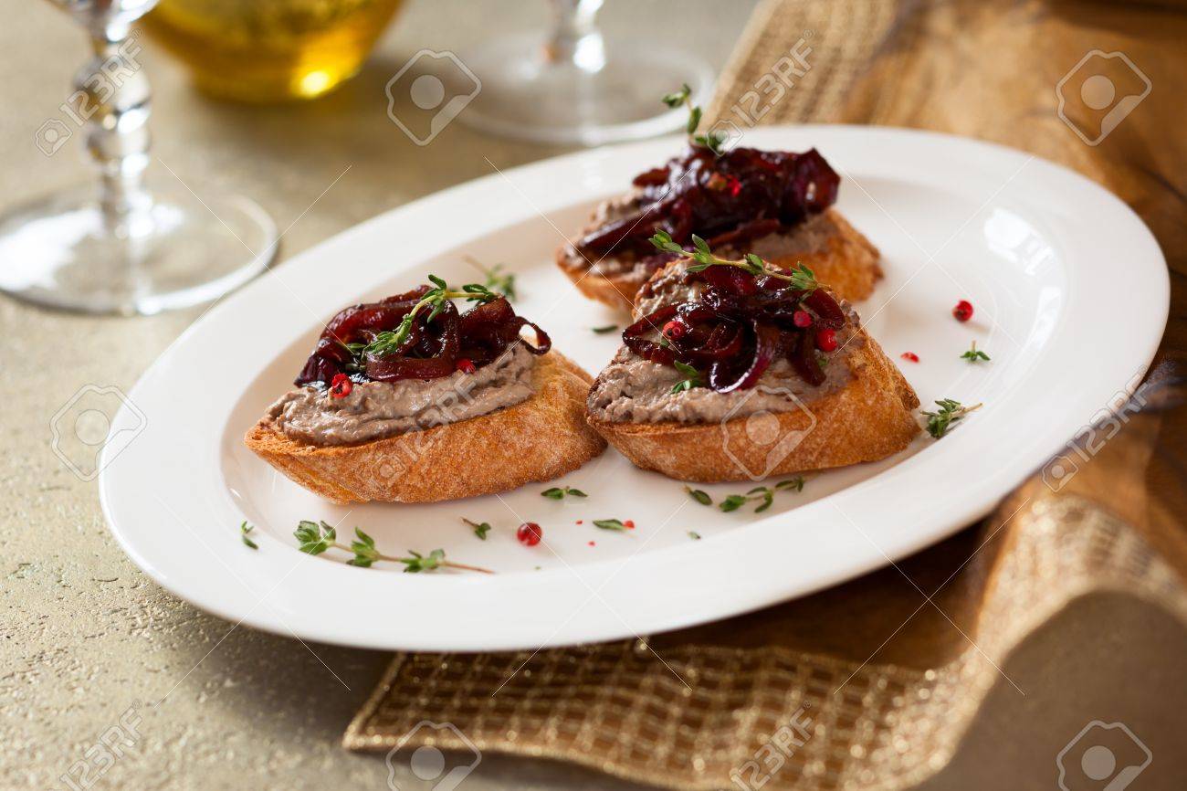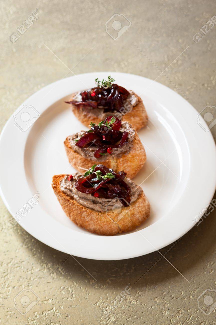 Immagini Stock Tartine Con Pate Di Fegato Di Pollo E Marmellata Di Cipolle Image