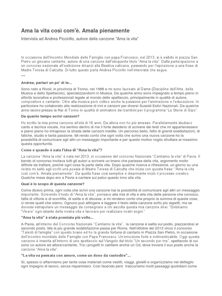 Così è la vita(1998) streaming italianoFilm Così è la vita(1998) in alta definizione streaming gratisFilm di trama completa, recensione, scaricare o trailer su ilgeniodellostreamingilgeniodellostreaming by igdsblog. Ama la vita così com’è Una poesia di Madre Teresa di Calcutta semplicemente meravigliosa un Inno alla Vita, che va sempre vissuta come un dono, Il miracolo della liquefazione del sangue di San Gennaro San Gennaro visse nel III secolo e fu vescovo di Benevento forse nato nel 272 dopo Cristo. Dopo qualche ricerca e riflessione, un giorno su una rivista mi saltò agli occhi una poesia di Madre Teresa di Calcutta che inizia con questa frase “Ama la vita così com’è Amala pienamente” Da quella frase cosi semplice e disarmante iniziò il processo creativo Qualche mese dopo ero a Pavia a cantare sul palco questo inno alla vita.