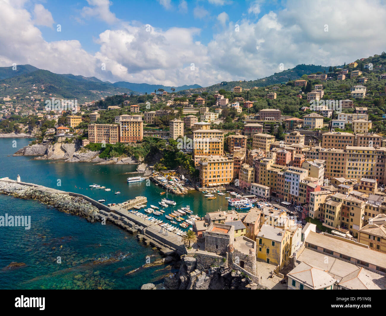 Vue Aerienne De La Ville De Camogli En Ligurie Italie Cote D Azur Mediterranee Pittoresque Vieille Ville Historique Camogli Aux Maisons Colorees Et Plage De Sable Photo Stock Alamy