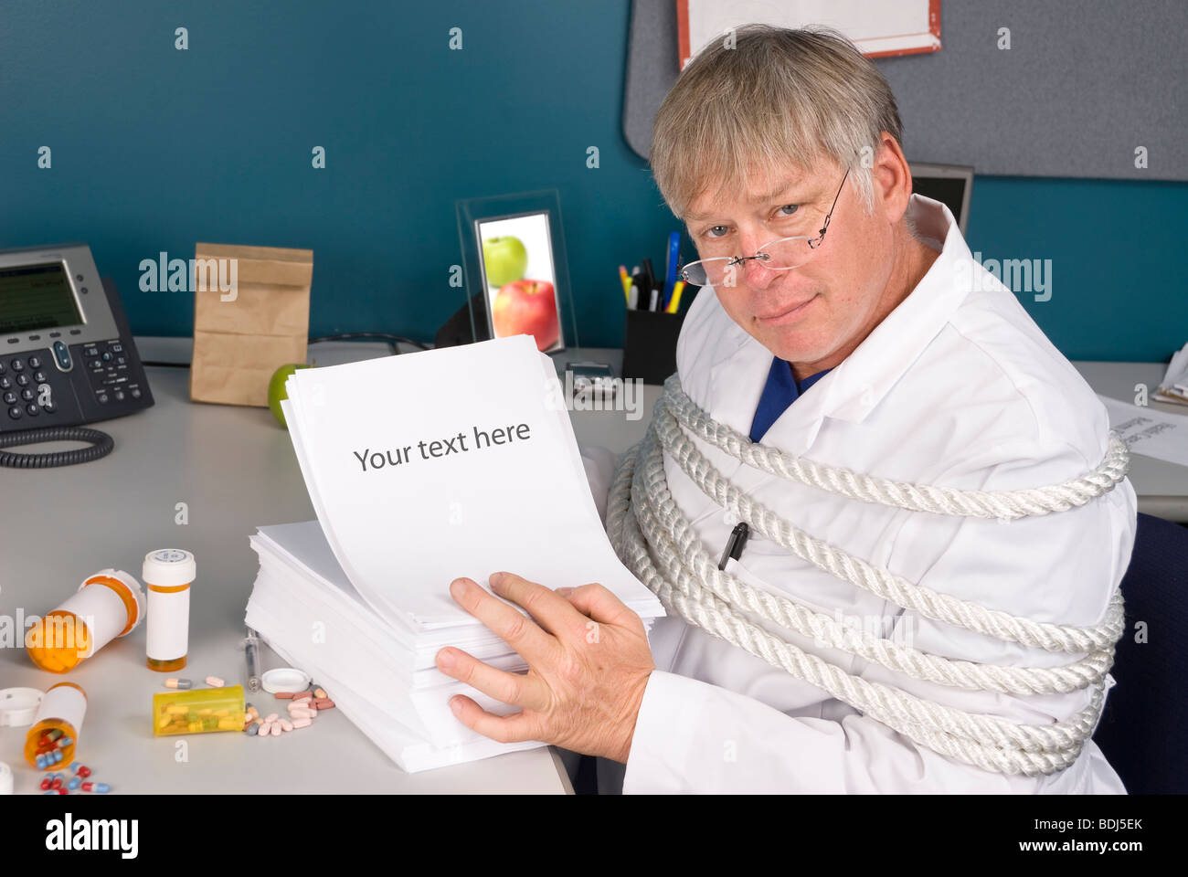 Un Medico E Legato Con Un Carico Di Pratiche Burocratiche Gli Impedisce Di Fare Il Suo Lavoro Foto Stock Alamy