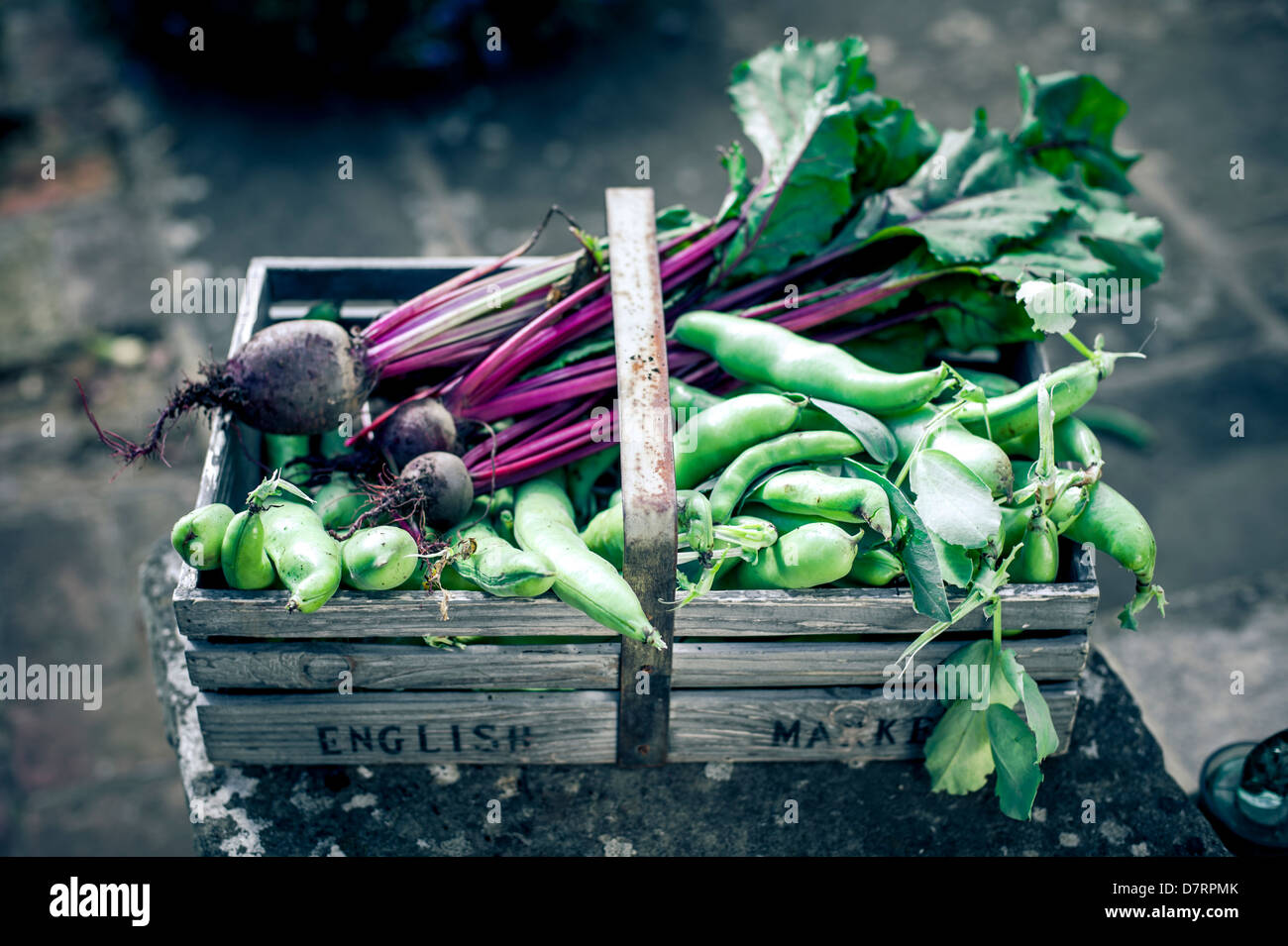 Giardinieri Di Un Cestello Di Legno Riempita Con Appena Raccolto Inglese Verdure Organiche Tra Cui La Barbabietola E Ampia Beans Foto Stock Alamy