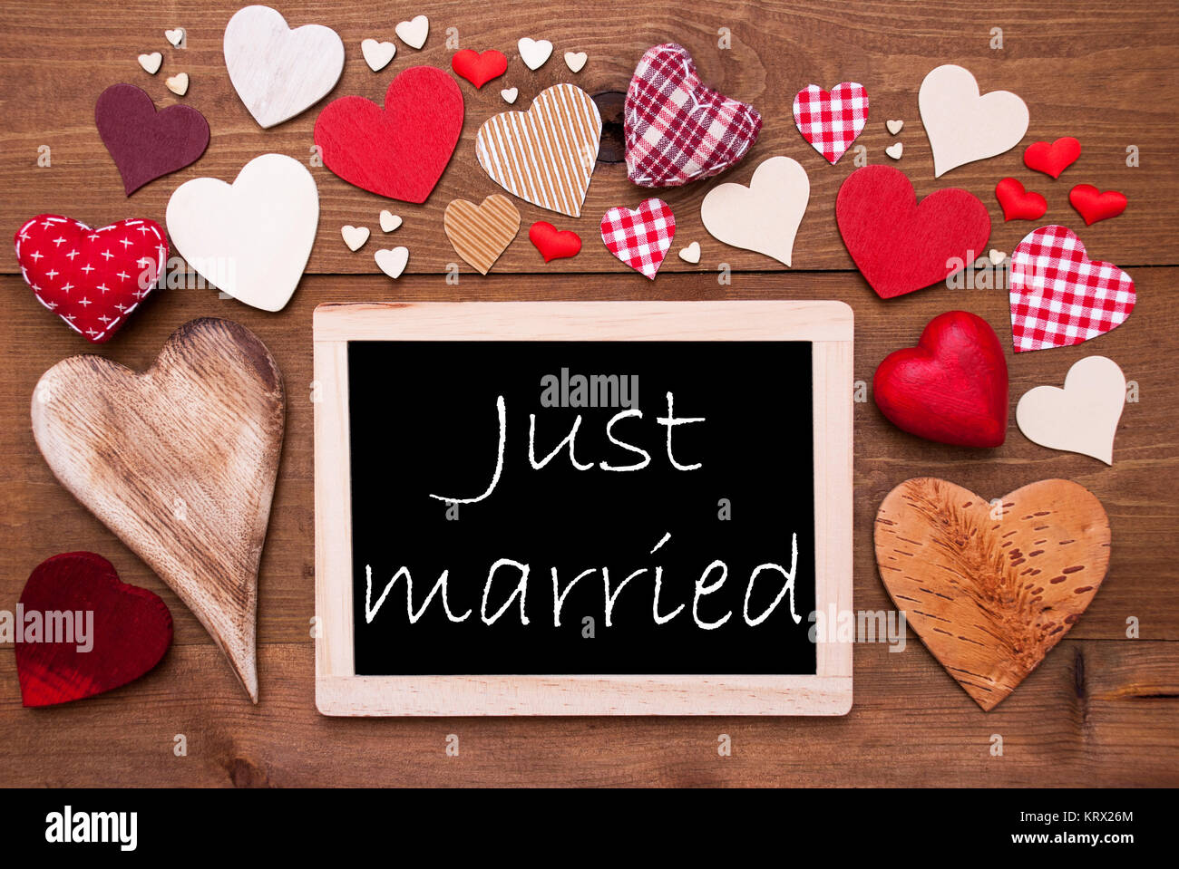 Lavagna Con Testo In Inglese Appena Sposato Molti Rossi Cuori Tessili Sfondo Di Legno Con L Annata Rustico O In Stile Retro Foto Stock Alamy
